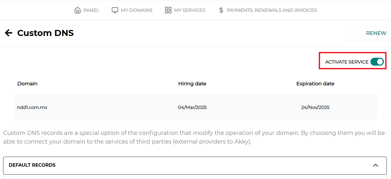 - The system will ask you to confirm the activation of the added registration, please note that when you make this move will be assigned our DNS so you only need to wait for the propagation of maximum 72 hours.