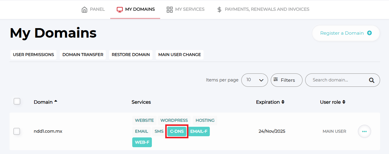- Go to the ‘MY DOMAINS’ menu.